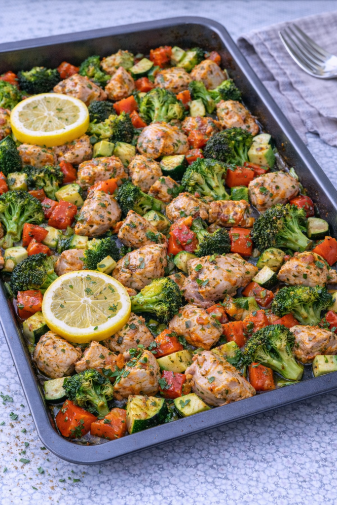 Backofen auf 200 °C vorheizen. Hähnchen in größere Stücke schneiden und mit Olivenöl, Salz, Pfeffer, Paprikapulver, Knoblauchpulver, Thymian, Zitronensaft und Zitronenabrieb vermengen. Gemüse in grobe Stücke schneiden, leicht salzen und unterheben. Alles auf ein Backblech geben und gleichmäßig verteilen. 25–30 Minuten backen, bis das Hähnchen durchgegart und das Gemüse weich ist. Vor dem Servieren nochmals mit etwas Zitronensaft abschmecken.